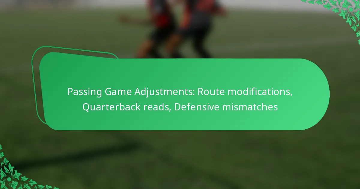 Passing game adjustments are essential for optimizing offensive strategies in football, focusing on route modifications, quarterback reads, and exploiting defensive mismatches. By adapting routes to counter defensive alignments, receivers can enhance their effectiveness, while quarterbacks must quickly assess the field to make informed decisions. These adjustments work in tandem to maximize the potential for successful completions and capitalize on defensive vulnerabilities.